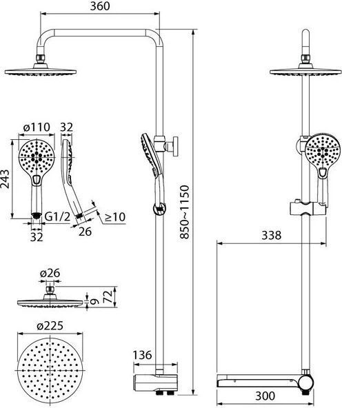 - Душевая стойка из нержавеющей стали 201 с матовым черным покрытием. Диаметр трубы 24 мм, регулируемая высота, высота 800-1100 мм