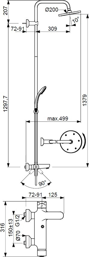 - удлиненная душевая труба (1298 мм) Ø25 мм для верхнего душа
