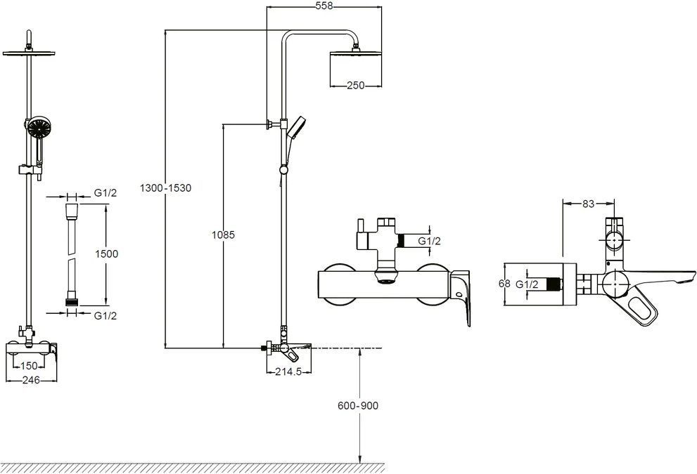 - Стандартный смеситель с изливом для ванны, душевая лейка с держателем, верхний душ, шланг