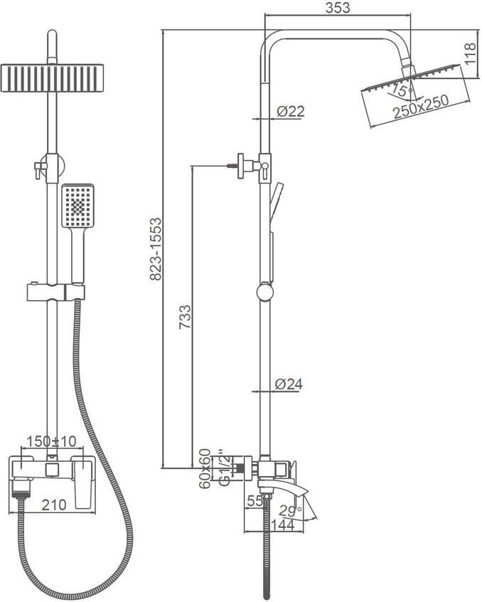 Душевая система с выдвижным изливом для ванны Ledeme L2478, количество режимов душевой лейки - 3, длина душевого шланга - 150 см, материал - латунь, цвет - хром.
