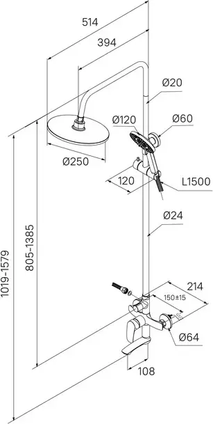 - 4-режимная ручная лейка (120 мм) с держателем, душевой шланг (1,5 м), штанга для душа с возможностью регулировки по высоте и крепеж идут в комплекте.