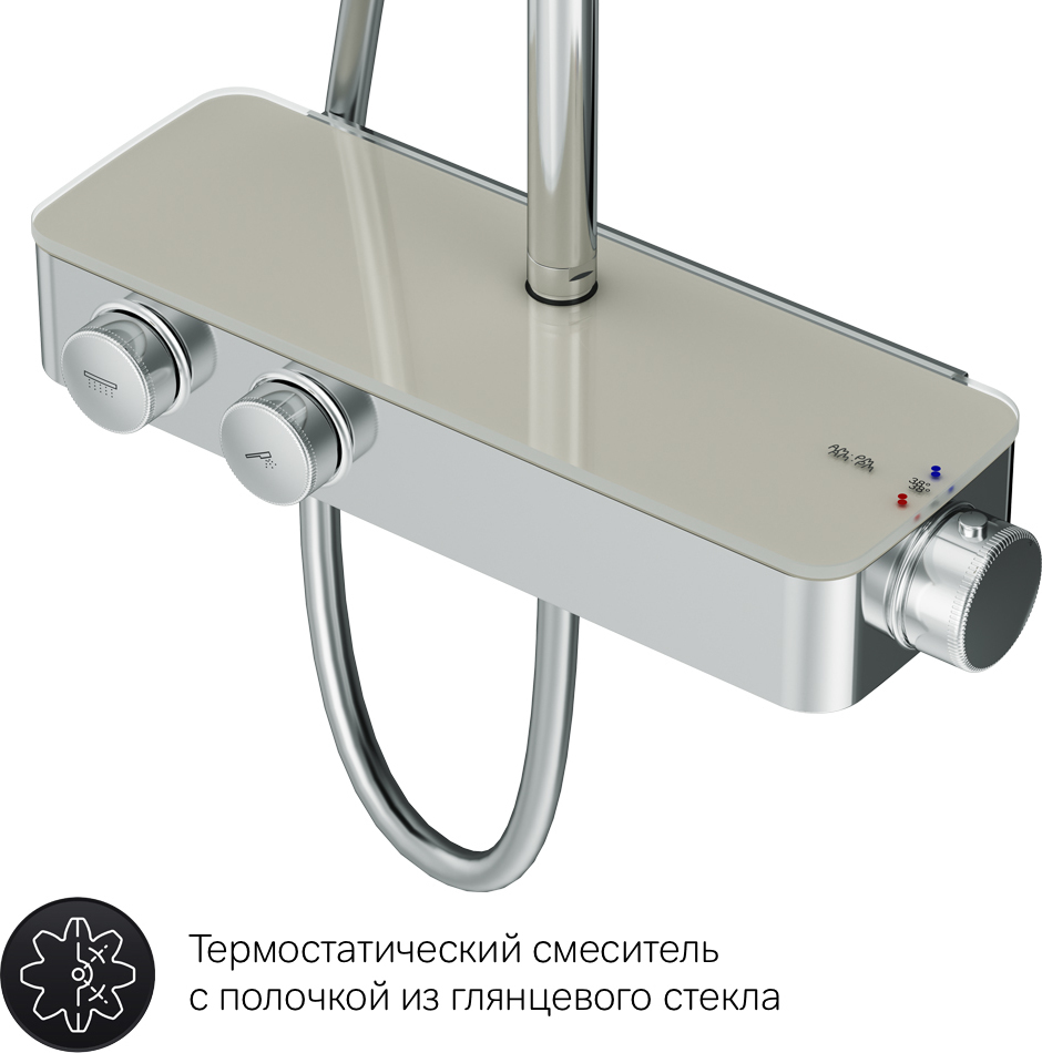 Душевая система Inspire V2.0 – это новый уровень удовольствия от принятия душа благодаря возможности индивидуальной настройки Вы можете управлять верхним и ручным душами с помощью удобных контроллеров расположенных на передней панели Включайте воду легким нажатием меняйте напор плавным поворотом ручки – и наслаждайтесь идеальным душем снова и снова ведь система запоминает выбранные вами параметры Продукт оснащен термостатическим смесителем для поддержания неизменной температуры воды Верхняя часть смесителя выполнена из глянцевого стекла и является интегрированной полочкой для нужных мелочей при приёме душа Удивительно тактильный ручной душ за счёт материала поверхности soft touch.