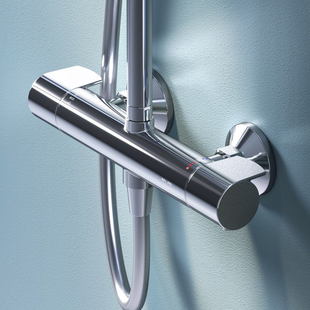 - Благодаря специально спроектированной эргономичной ручке вы можете управлять душевой системой даже с мыльными руками. Термостатический картридж с высокочувствительным термоэлементом и быстрой реакцией на изменения температуры или давления надежно защищает от ожога даже при внезапном отключении холодной воды.