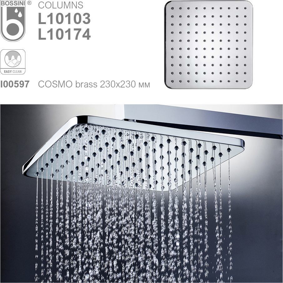 - Верхний душ из коллекции Cosmo 230х230 мм изготовлен из латуни, рекомендованный минимальный расход воды - 7 л/мин