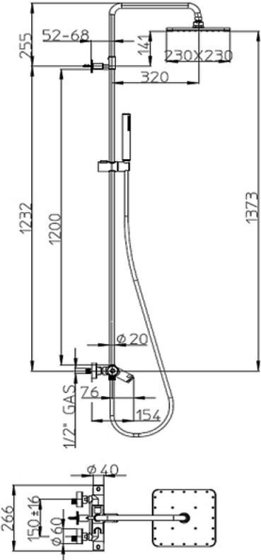 - Душевая штанга: 2х136,5 см (высота регулируется при помощи подрезки трубы).