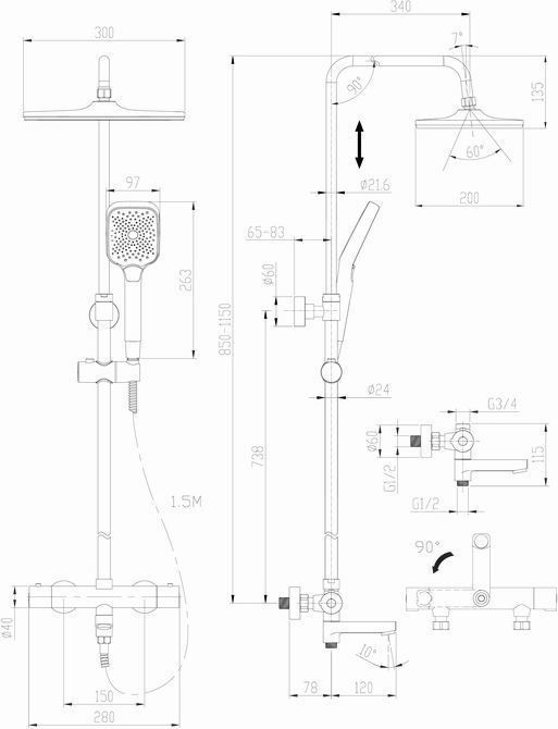 - Комплектация: душевой набор (тропический душ, душевая лейка, подставка для душа, душевой шланг), смеситель