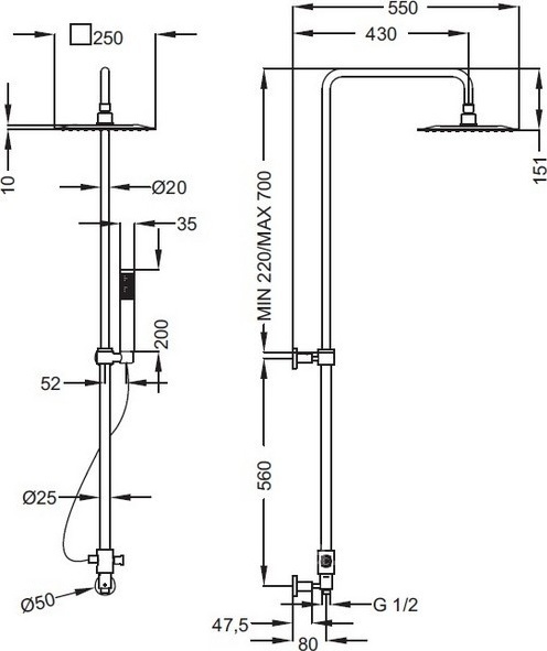 - Верхний душ - 250 мм;