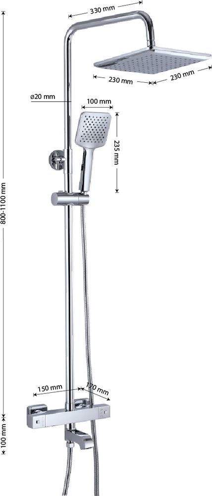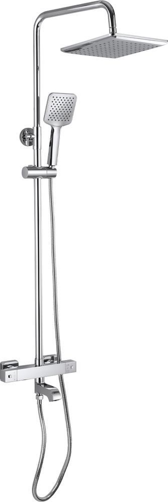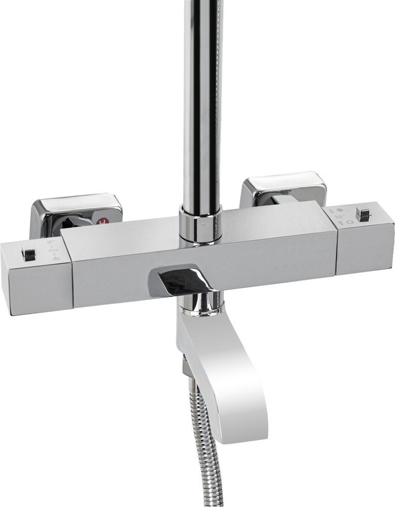 Смеситель с термостатом + стойка душевая телескопическая "тропический душ" – надежное сантехническое оборудование. Латунный, хромированный квадратный корпус с круглым коротким изливом, поворот которого является переключением подачи воды. Температура и напор воды устанавливаются поворотом двух удобных рукояток. Термостат поддерживает заданную температуру воды и может работать в системах низкого давления с газовыми проточными водонагревателями. Ограничитель температуры до 38 градусов спасает от возможного ожога при случайном повороте рукоятки. Встроенный аэратор формирует комфортный и приятный поток воды. Сеточка легко снимается для удаления налета. Аксессуар оснащен термостатическим картриджем с шумоподавлением и керамической кран-буксой, стойка с двумя квадратными хромированными лейками и шланг хромированный. Габаритные размеры: высота стойки 800 - 1100 мм, длина излива стойки 330 мм, лейка для душа 100 мм двухрежимная, лейка тропического душа 230*230 мм, длина гусака 170 мм, шланг 150 см. Вес - 5,0 кг, объём - 0,035 м3. В комплекте корпус, стойка, 2 лейки, шланг, паспорт и комплект прокладок.