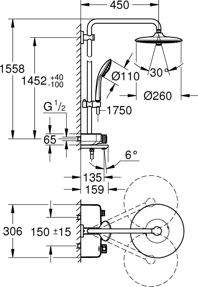 - Euphoria 260 Верхний душ (26 455) 3 вида струй: Rain, SmartRain, Jet, с шаровым шарниром, угол поворота ± 15°