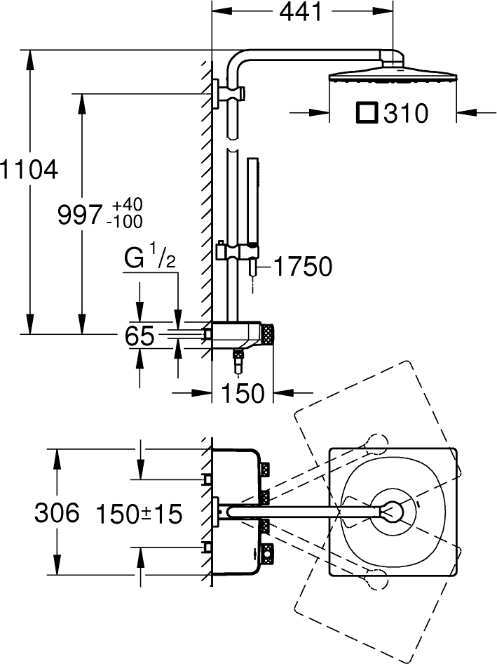 - ручной душ Euphoria Cube Stick регулируется по высоте с помощью скользящего элемента