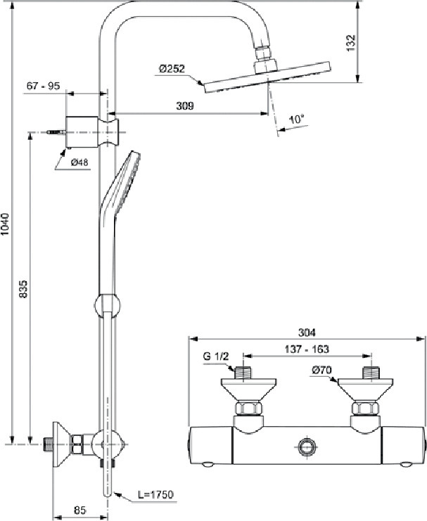 - душевая система в комплекте с настенным термостатическим смесителем для душа с двумя выходами Ceratherm 100 A4639AA
