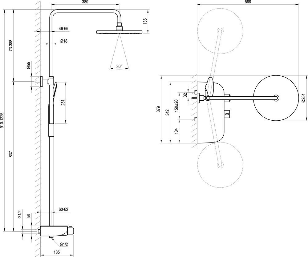 - Высота душевой стойки: регулировка в диапазоне 91 – 122,5 см