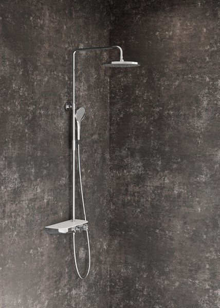 Душевая стойка оснащена термостатическим смесителем, полкой, верхним душем и ручной лейкой с тремя режимами. Термостатический смеситель мгновенно реагирует на перепады давления и температуры, гарантируя, что вода будет иметь ту температуру, которую Вы установите. Тот, кто хоть раз попробовал принять душ с термостатическим смесителем, уже никогда не откажется от него. Новая функция остановки, благодаря которой вы можете остановить подачу воды нажатием кнопки – например, при намыливании головы. Когда вы снова нажмете кнопку "Stop", вода снова потечет и будет иметь ту же температуру, которую вы установили ранее.