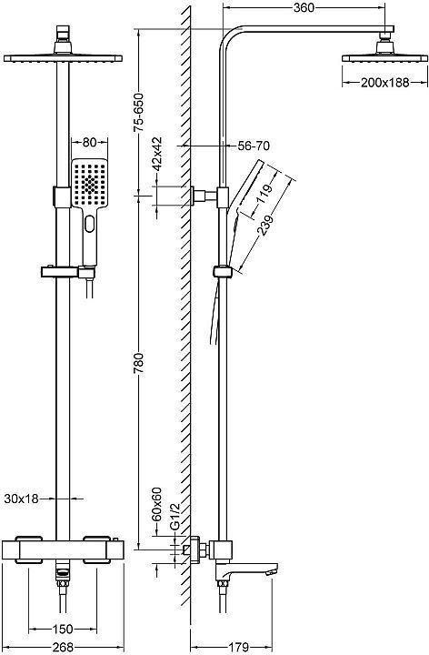 - Размер верхнего душа: 200 x 188 мм