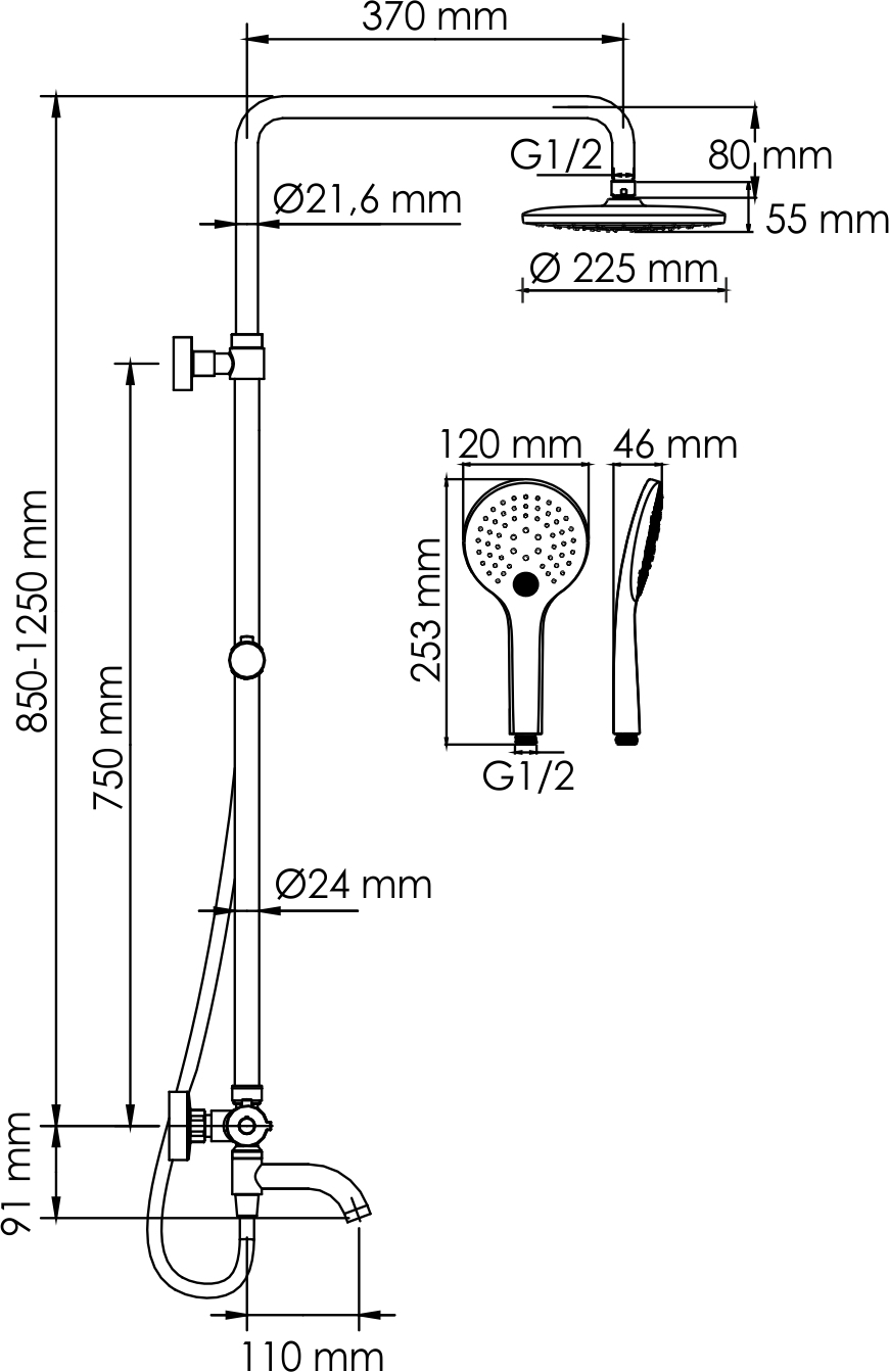 - Стойка для душа, Ø 22 мм регулируемая по высоте