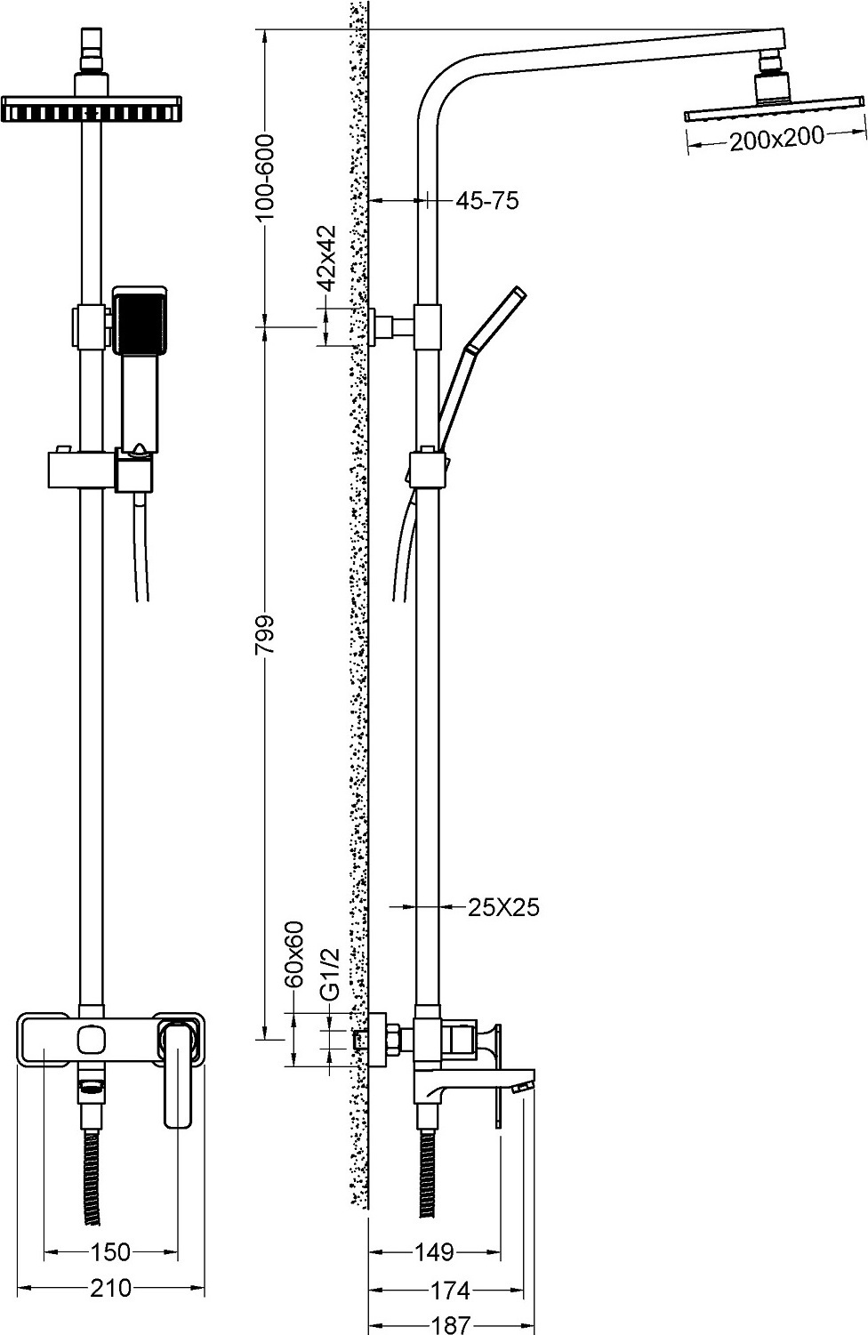 - Штанга душевой системы регулируется по высоте