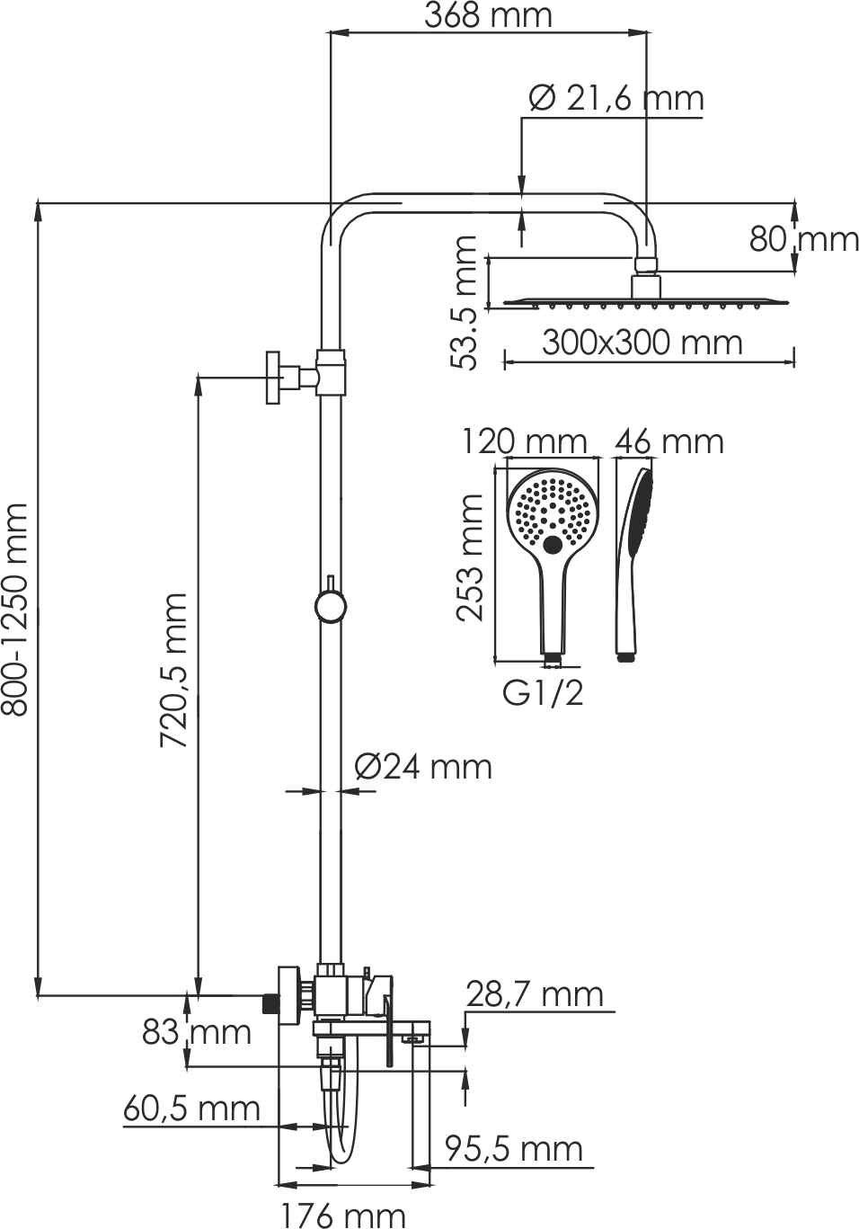 - Стойка для душа, Ø 24 мм регулируемая по высоте