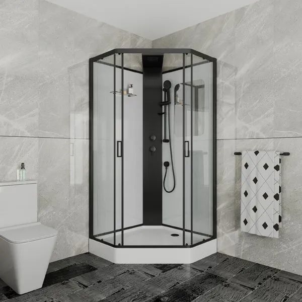 Душевое кабина Grossman Elegans, размер 900х900х2170 мм, профиль чёрный, стекло прозрачное. Низкий поддон и сифон в комплекте.