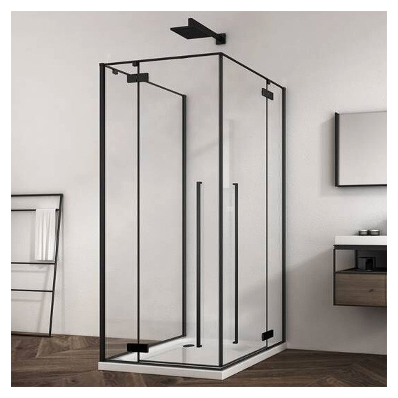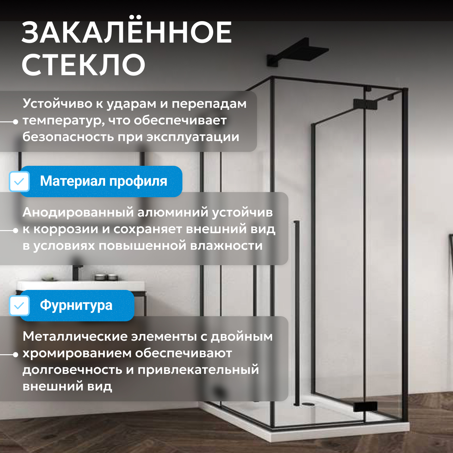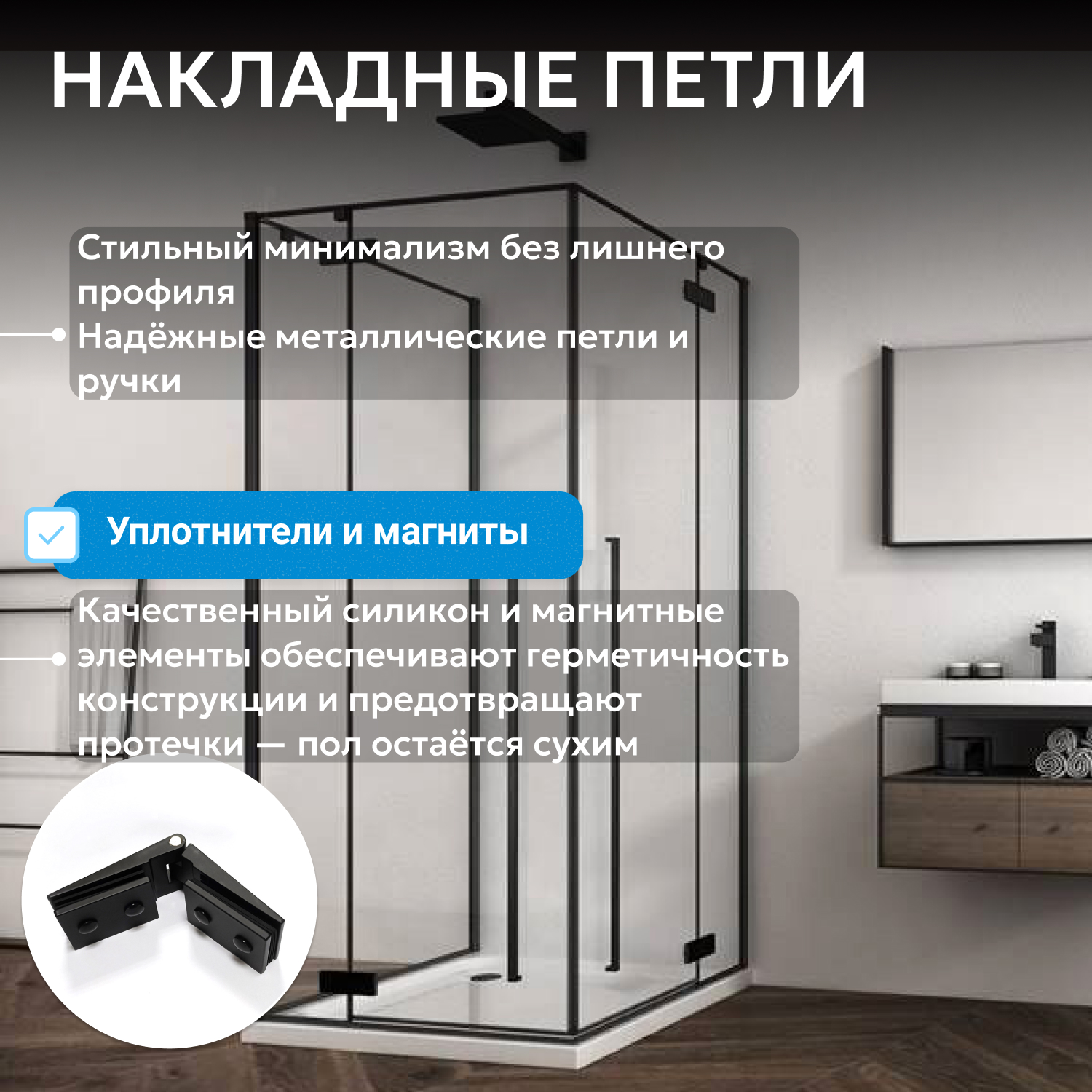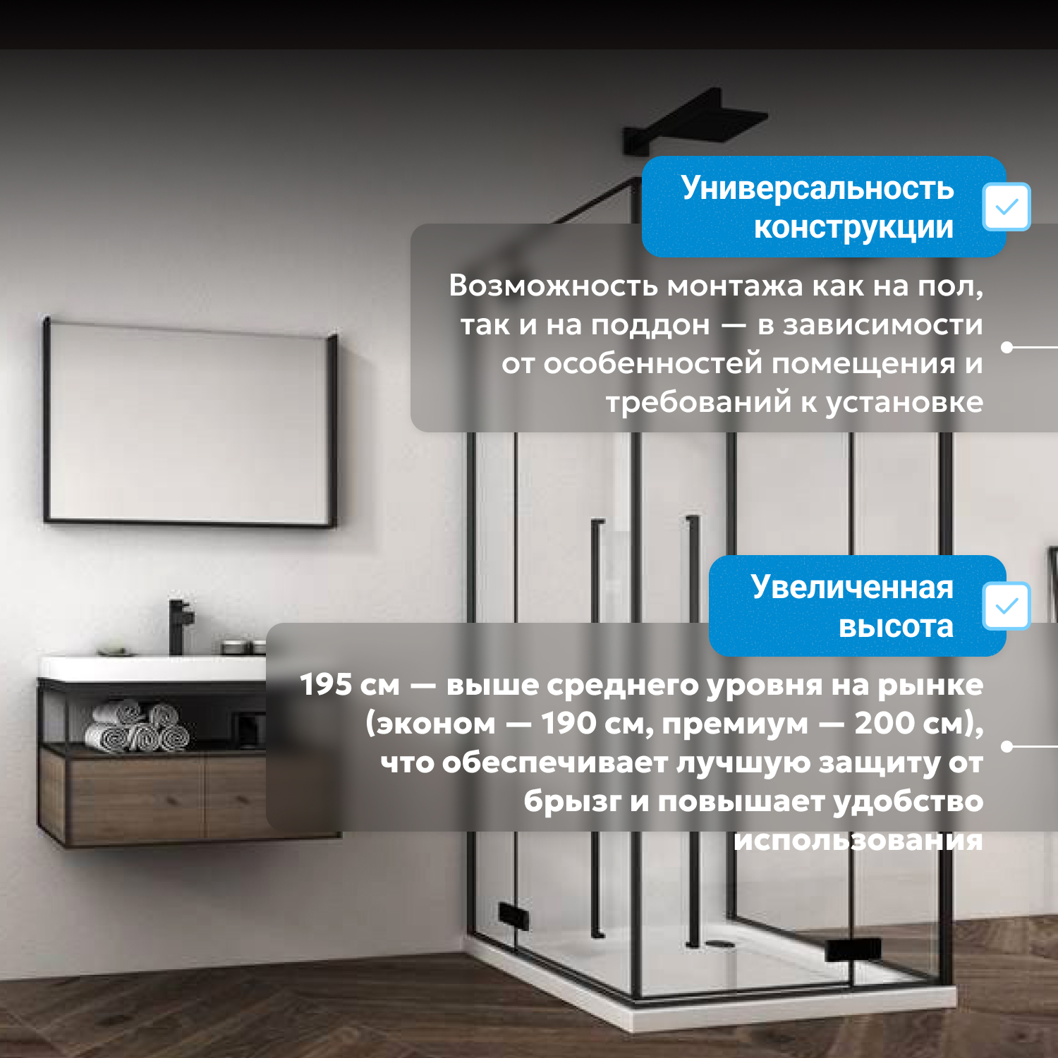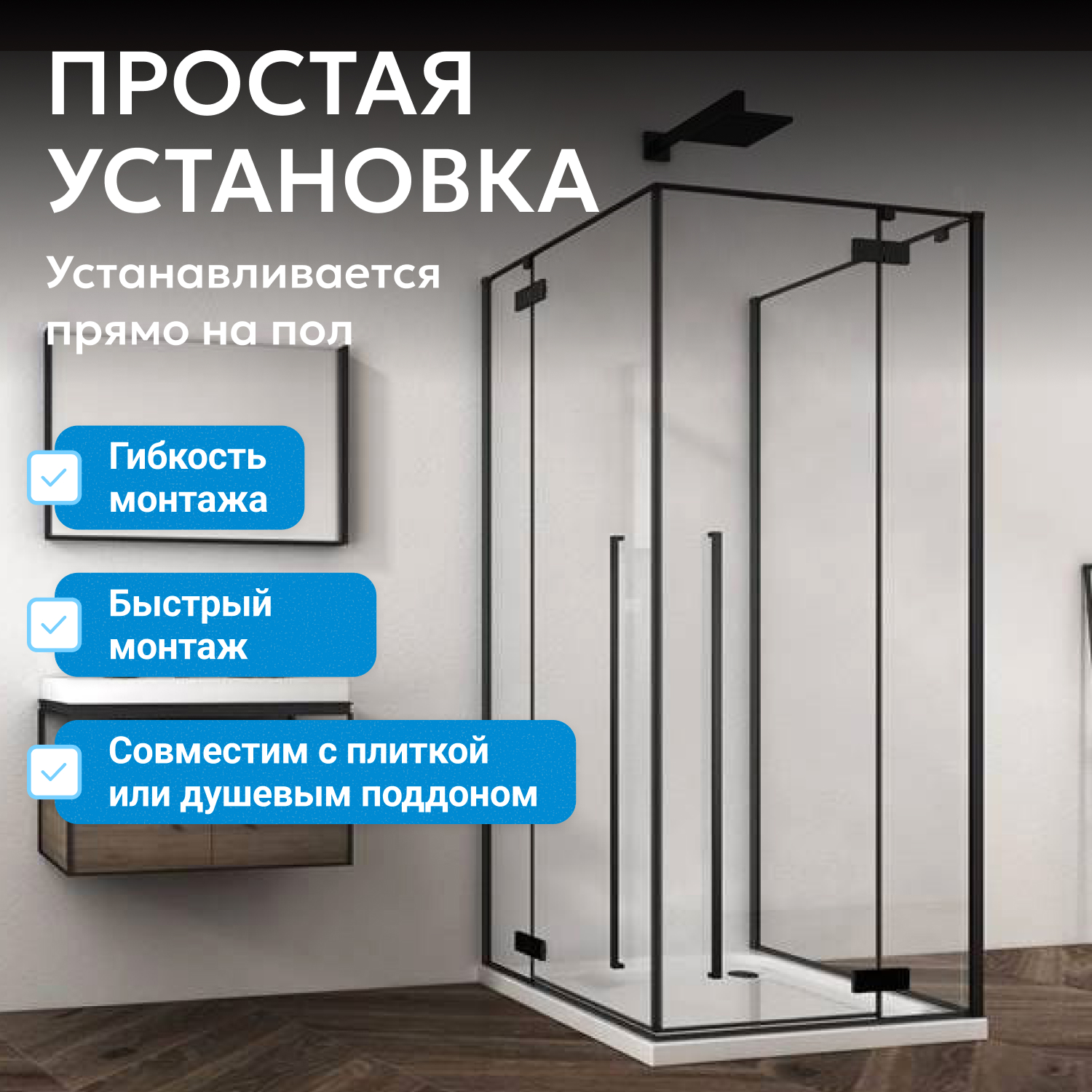 Подходит для проектов, где требуется душевой уголок без поддона, угловой душевой уголок 90×90 или аналогичные большие душевые уголки с черным профилем и усиленной фурнитурой.