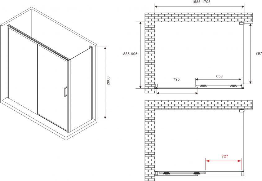 Душевое ограждение Abber Komfort, размер 1700х900х2000 мм, профиль хром, стекло прозрачное 8 мм, габариты регулировки (1685-1705)х(885-905)х2000 мм, вход 727 мм. Поддон приобретается отдельно. Дверь 170 см, душевая стенка 90 см.