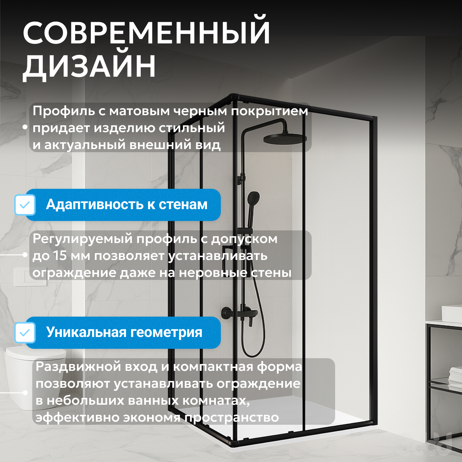 - Чёрный профиль подходит для современных интерьеров, а универсальная модификация облегчает подбор дополнительной сантехники и низкого поддона подходящего размера. Высота конструкции 190 см оптимальна для большинства помещений, модель поставляется без поддона для индивидуального выбора. Прозрачное стекло визуально увеличивает пространство и подчёркивает строгие линии дизайна.