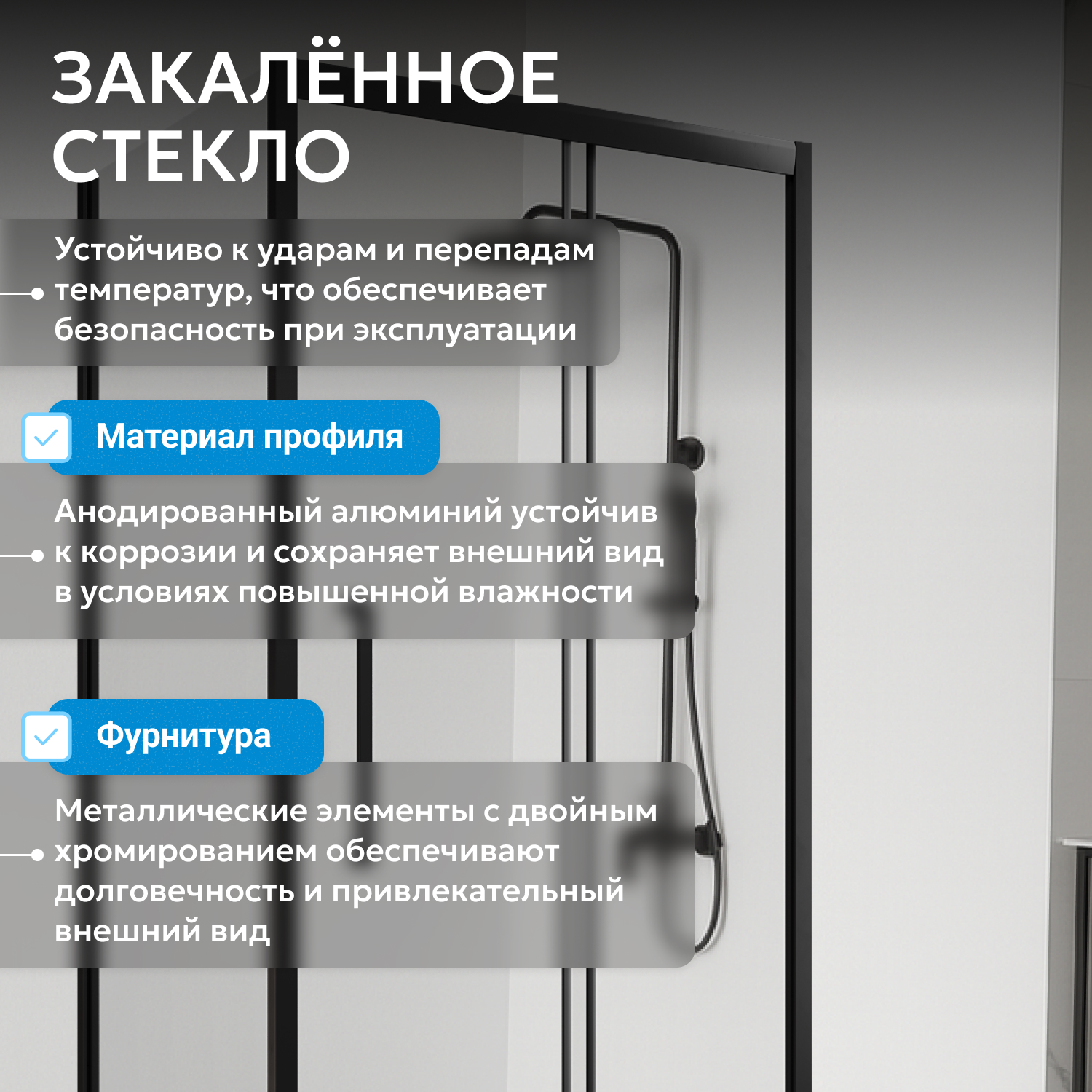 - Прямоугольная форма, чёрный профиль и прозрачное закалённое стекло толщиной 6 мм создают актуальный внешний вид и обеспечивают прочность конструкции.