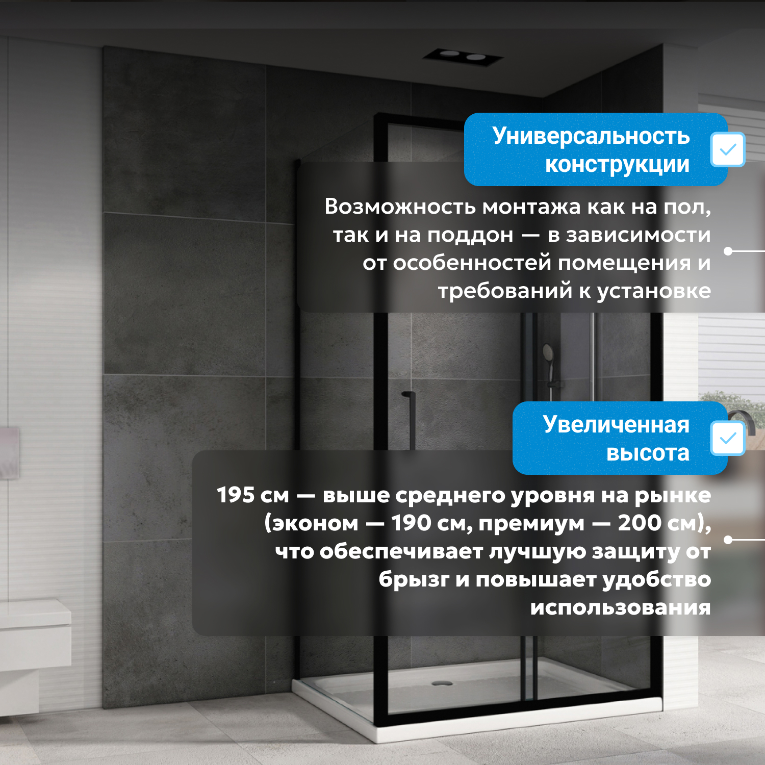 - Душевой поддон не входит в комплект и приобретается отдельно, что позволяет выбрать подходящий по высоте и материалу вариант.