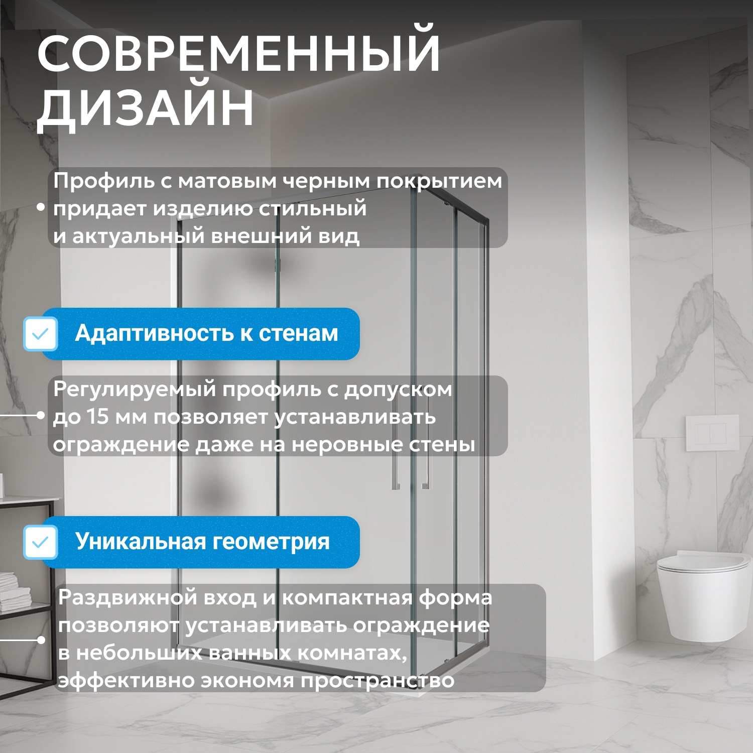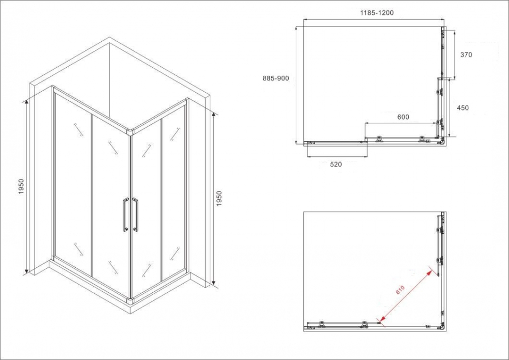 - Модель выполнена в прямоугольной форме, устанавливается в угол для экономии пространства. Раздвижные двери оснащены двойными роликами и металлическими ручками для плавного и долговечного доступа внутрь. Вход шириной 610 мм удобен для пользователей разного возраста.