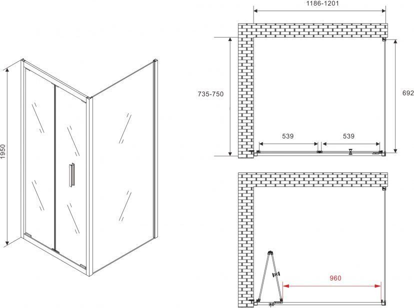 Душевое ограждение Abber Sonnenstrand, размер 1200х750х1950 мм, профиль чёрный, стекло прозрачное 6 мм, габариты регулировки (1186-1201)х(735-750)х2000 мм, вход 960 мм. Поддон приобретается отдельно. Дверь 120 см, душевая стенка 75 см.