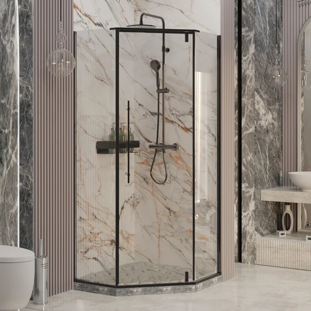 Душевое ограждение Ambassador Ritz, размер 900х900х2000 мм, профиль чёрный, стекло прозрачное 8 мм. Габариты регулировки (885-900)х(885-900)х2000 мм, ширина входа 602 мм. Поддон приобретается отдельно.