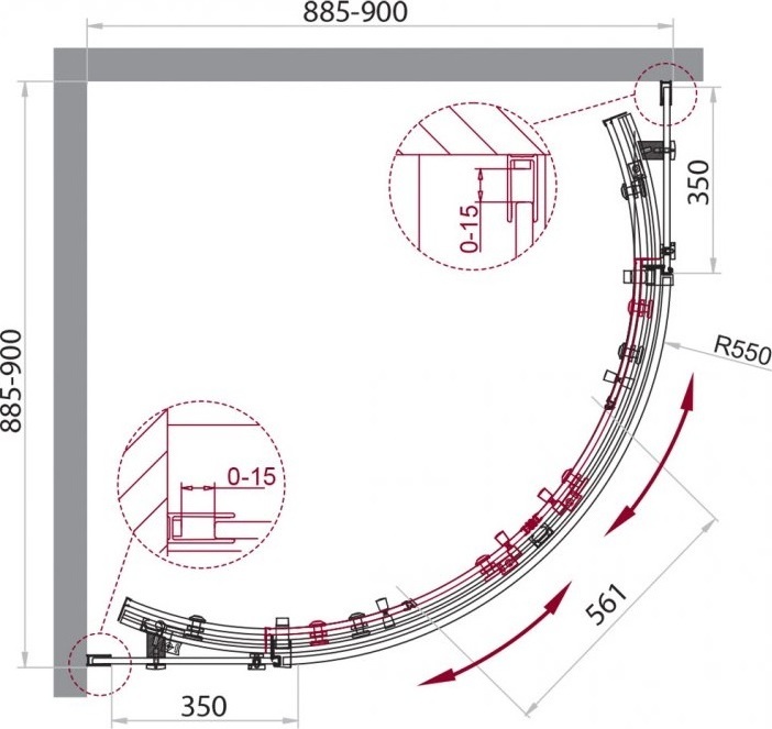 - Габариты с диапазоном регулировок: (885-900)x(885-900)x1950 мм