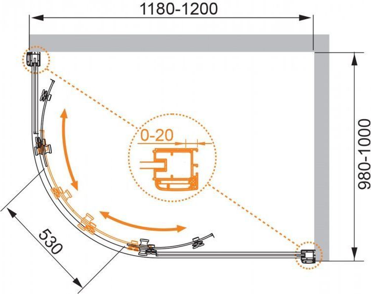 Душевое ограждение Cezares Anima RH-2 1200х1000х2000 мм, цвет стекла - прозрачное, цвет профиля - хром, поддон приобретается отдельно. Габариты с регулировками: (1180-1200)х(980-1000) мм. Ширина входа 530 мм.