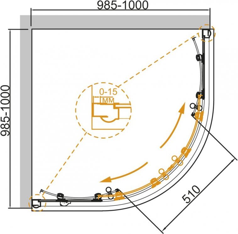 - Габариты с диапазоном регулировок: (985-1000)x(985-1000)x1950 мм