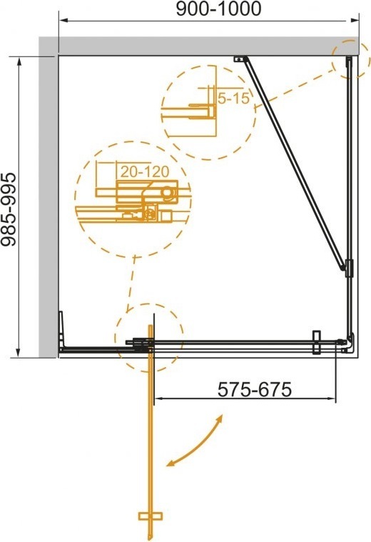 - Конструкция петли позволяет регулировать ширину входа душевого ограждения в диапазоне 10 см