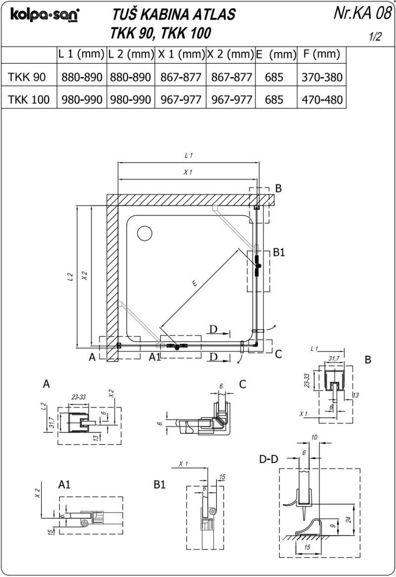 Душевое ограждение Kolpa-San Atlas TKK 1000x1000 мм, цвет стекла - прозрачное, 6 мм, цвет профиля - хром. Размеры с диапазоном регулировок: (980-990)x(980-990) мм. Ширина входа: 685 мм. Поддон и сифон приобретаются отдельно.