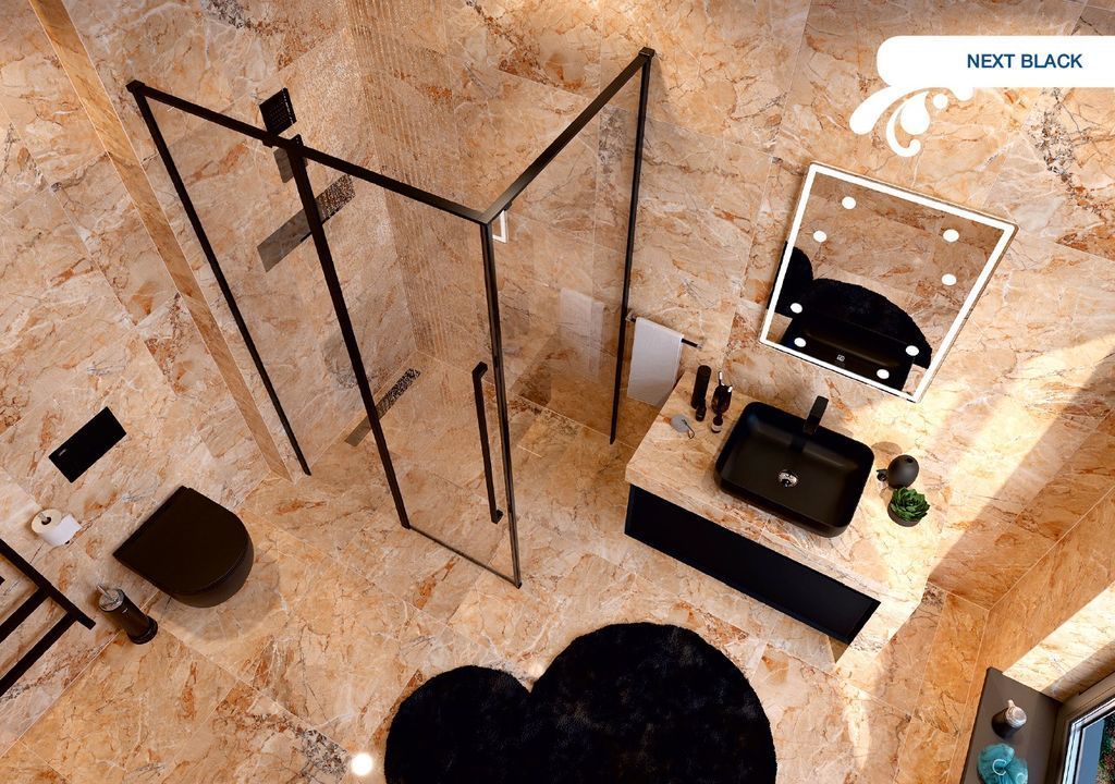 - Душевое ограждение для ванной комнаты Next Black является универсальной. Оно может монтироваться на правую или левую сторону. Матовый чёрный анодированный алюминиевый профиль возможностью регулировки 15 мм с каждой стороны стены. Прозрачное закаленное стекло толщиной 6 мм выдерживает случайные удары, что делает ограждение надежным и безопасным в ежедневном использовании. Петли выполнены из сплава металлов. Ручка из нержавеющей стали Ш15 x Г25 мм, матовая черная аэрозольная краска, расстояние между центрами отверстий 885 мм. Все это обеспечивает длительный срок их службы данного изделия.