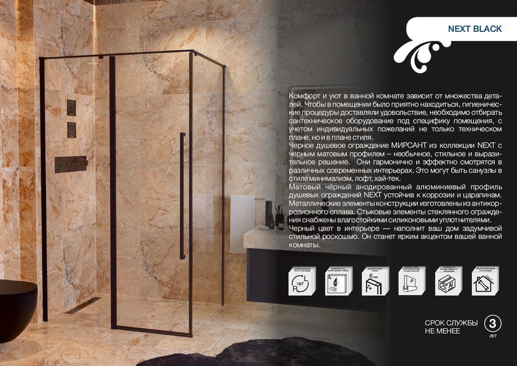 - Черное душевое ограждение МИРСАНТ из коллекции NEXT с черным матовым профилем – необычное, стильное и выразительное решение. Они гармонично и эффектно смотрятся в различных современных интерьерах. Это могут быть санузлы в стиле минимализм, лофт, хай-тек.