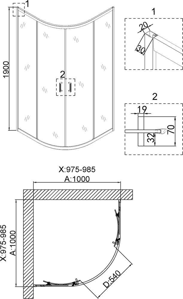 Душевое ограждение Niagara Nova NG-6407-08 1000х1000х1900 мм, профиль – желтое золото, стекло – прозрачное, 6 мм, ширина входа 540 мм, габариты с регулировками: 975-985x975-985 мм. Душевой поддон приобретается отдельно.