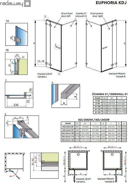 Душевое ограждение Radaway Euphoria KDJ 1200*1200*2000 мм. Профиль - хром, стекло - прозрачное 8 мм. Поддон приобретается отдельно. Душевое ограждение доступно в правом и левом вариантах (на фото левый вариант).