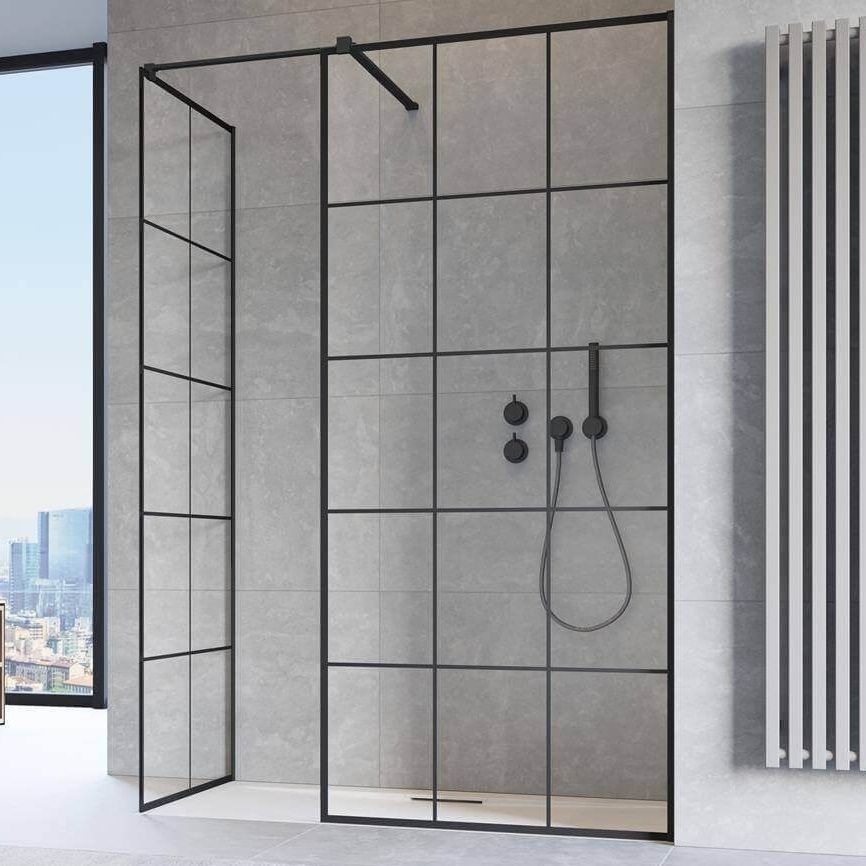 Душевое ограждение Radaway Modo X Black III Factory 1100х700х2000 мм. Цвет профиля – черный, цвет стекла – прозрачное с черной решеткой из керамической краски, 10 мм. В комплект входит 2 перегородки с держателем и промежуточный кронштейн.