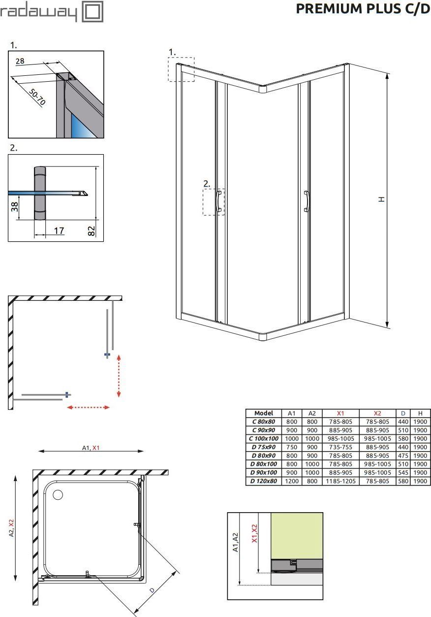 Душевое ограждение Radaway Premium Plus D 750х900х1900 мм. Профиль - хром, стекло - прозрачное, 5-6 мм. Размеры с диапазоном регулировок: (735-755)x(885-905) мм. Ширина входа: 440 мм. Поддон приобретается отдельно.
