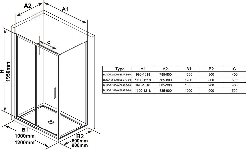Душевое ограждение Ravak Blix Slim BLSDP2+BLSPS, размер 110х90х195 см. Профиль чёрный, стекло Transparent, вход 450 мм. Габариты регулировки (1090-1118)х(885-900)х1950 мм.