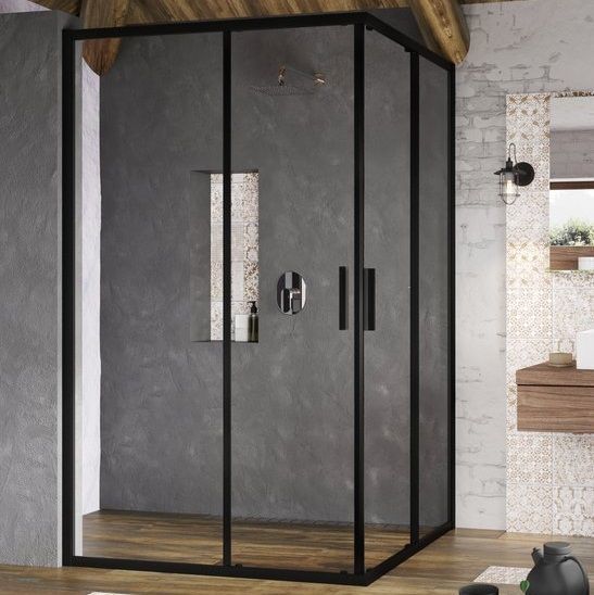 Душевое ограждение Ravak Blix Slim BLSRV2K, размер 120х90х195 см с угловым входом. Профиль чёрный, стекло Transparent. Габариты регулировки (1186-1200)х(886-900)х1950 мм.