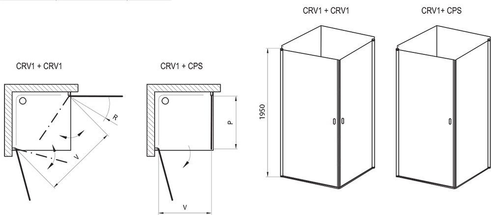 Душевое ограждение Ravak Chrome CRV1+CRV1-90, размер 90х90х195 см с угловым входом. Профиль - белый, стекло - Transparent.