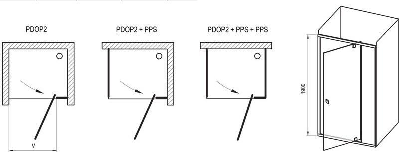 - Комбинация с двумя неподвижными стенками типа PPS позволяет создать „П“- образный душевой уголок.