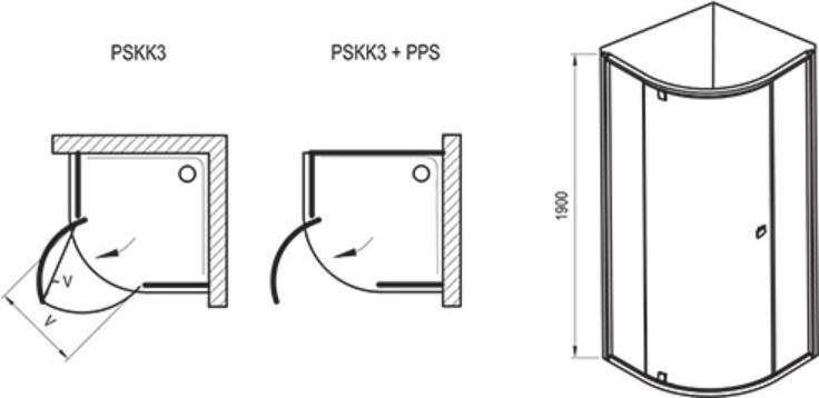 - Возможна установка у стены ванной комнаты при комбинации с неподвижной стенкой PPS.