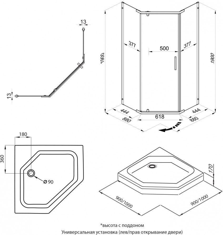 Душевое ограждение Triton Дека с низким поддоном, размер 900x900х2070 мм, профиль хром, стекло прозрачное.
