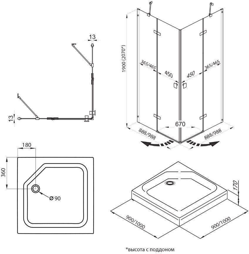 Душевое ограждение Triton Дельта с держателями, размер 900x900х1900 мм, профиль хром, стекло прозрачное. Поддон приобретается отдельно.