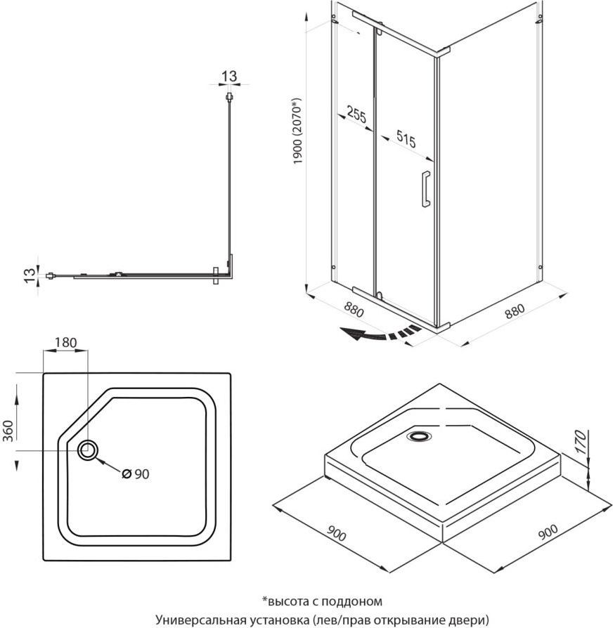Душевое ограждение Triton Терра 900x900x2020 мм с низким поддоном и сифоном в комплекте, профиль хром, стекло прозрачное.