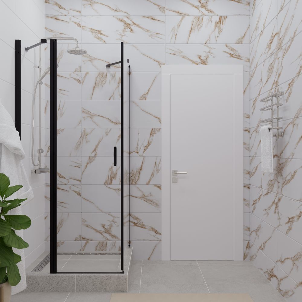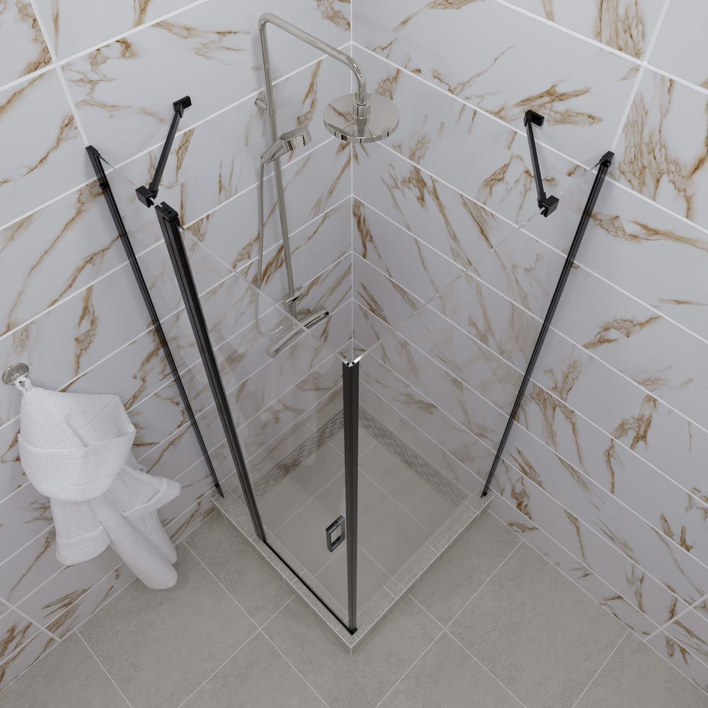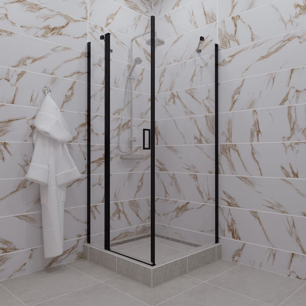 Душевое ограждение Triton Йота 900x900x2020 мм с низким поддоном и сифоном в комплекте, профиль чёрный, стекло прозрачное.